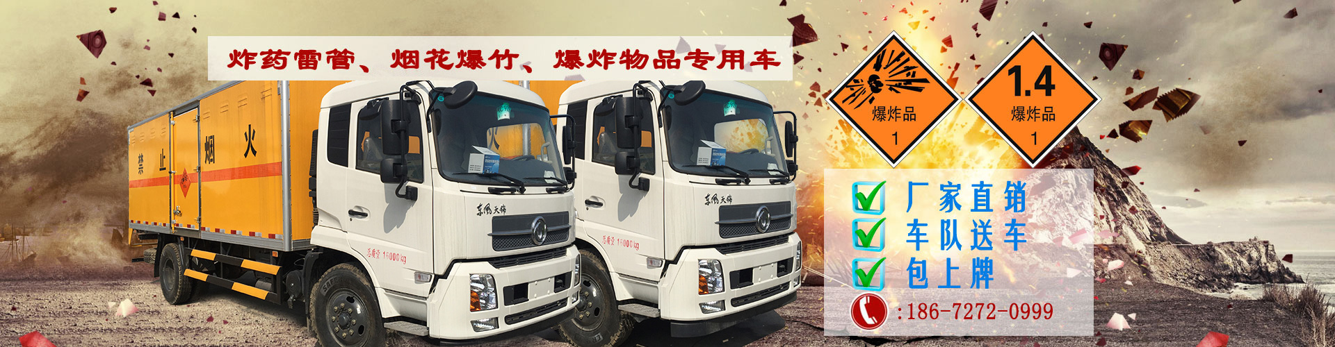 陕西危险品运输公司一次性在我司购买10台10吨东风天锦炸药运输车,东风天锦10吨炸药运输车运输独立容器(瓶)包装的货物;EX/Ⅲ型车辆;危险货物类项号:1.1 D,1.1B,1.1G ,1.1C,1.3C,1.4G
